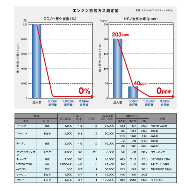 ・また、エンジン排気ガス値とエンジン圧縮圧測定値(Mpa)にも改善が見られ、環境にも優しいドライブになります。