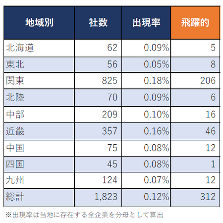 100億円企業の所在地を地域別に見ると、東京都を含む「関東」が825社(うち飛躍的成長企業は206社)と突出している。次いで、「近畿」(357社)、「中部」(209社)となり、商圏規模を確保できる都市圏が続いた。全企業数に占める100億円突破企業の割合(本稿では「出現率」と表記)で見ても上記3地域が上位となる。