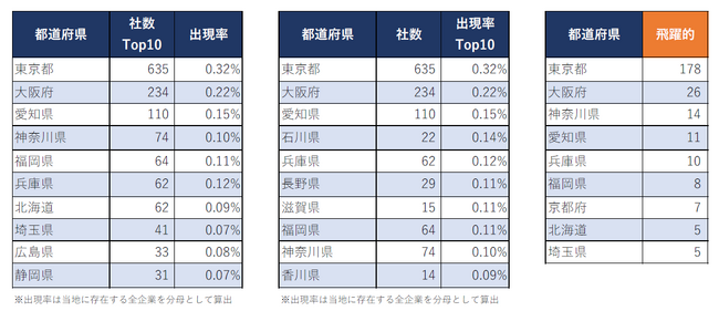 都道府県別に見ると、社数ベースで上位となるのは「東京都」(635社)、「大阪府」(234社)、「愛知県」(110社)で、そのほかでも地方の中核都市がランクインしている。