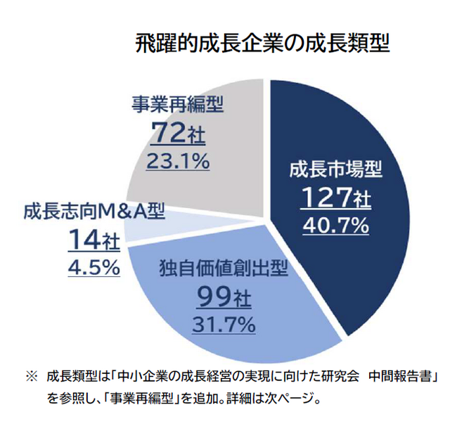 飛躍的成長企業を類型化すると、成長産業を捉えた「成長市場型」が最多で127社(同40.7%)、競争力を高めた「独自価値創出型」が99社と続く