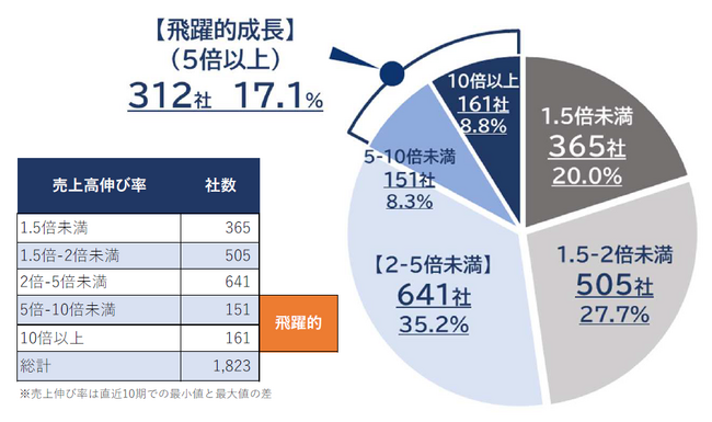 また、年売上高が5倍以上に伸びた企業を「飛躍的成長」企業と定義すると、1,823社中17.1%にあたる312社が該当した。