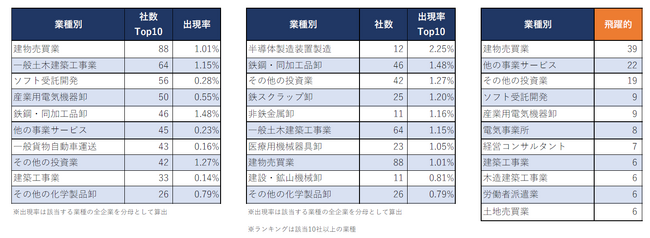 出現率で見ると、市場成長が続く半導体関連の「半導体製造装置製造」が最も高い2.25%となり、50社に1社は100億円突破企業であることが分かった。以下、相場変動により業績が膨らみやすい「鉄鋼・同加工品卸」(1.48%)、「投資業」(1.27%)、「鉄スクラップ卸」(1.20%)が続く。