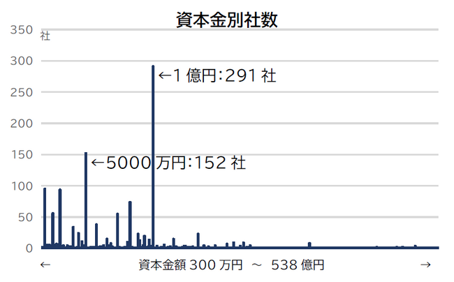 100億円規模への業容拡大には、一定の資本力が必須であり、エクイティファイナンスなど直接調達の実施が欠かせない。資本金額別で見ると、資本金1億円が291社で最多となっている。