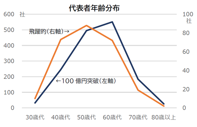 100億円突破企業の代表者年齢を見ると、最も多いのは「60歳代」(551社)。次いで「50歳代」(491社)となった。また、飛躍的成長企業では、「50歳代」が最多で88社。次いで「40歳代」(73社)となっており、飛躍的成長企業の方が、代表年齢が若くなっている。