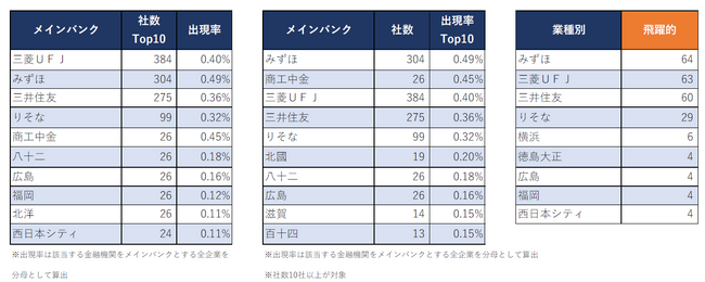 出現率では、「みずほ」(0.49%)が最も高く、次いで政府系の「商工中金」(0.45%)がランクインしている。また、「北國」(0.20%)や「八十二」(0.18%)、「滋賀」(0.15%)など、都道府県別でランクインした各地域の地方銀行が上位に入っている。