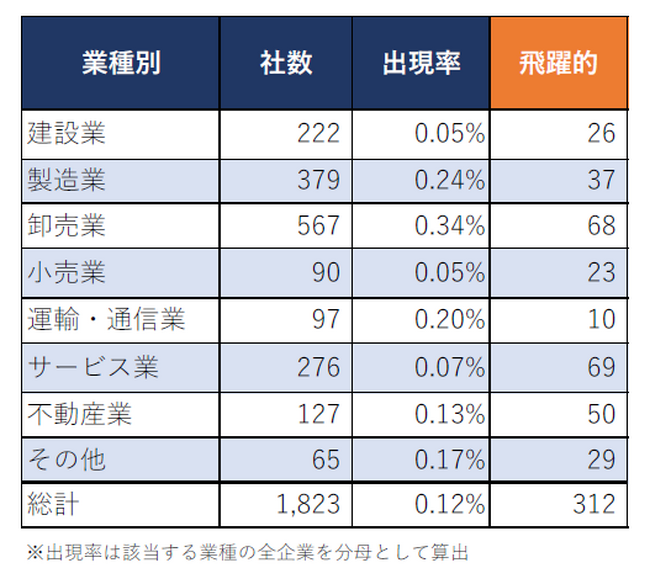 年売上高100億円突破という観点で見ると、上記のように取扱量を増やすことで中間利益を確保する卸売業や、相場変動なども含めて商品単価が高くなる業態が多くなりがちではある。半面、出現率の低い業種で100億円突破企業となれば、競争力でより優位なポジションを確保できる可能性も指摘できよう。
