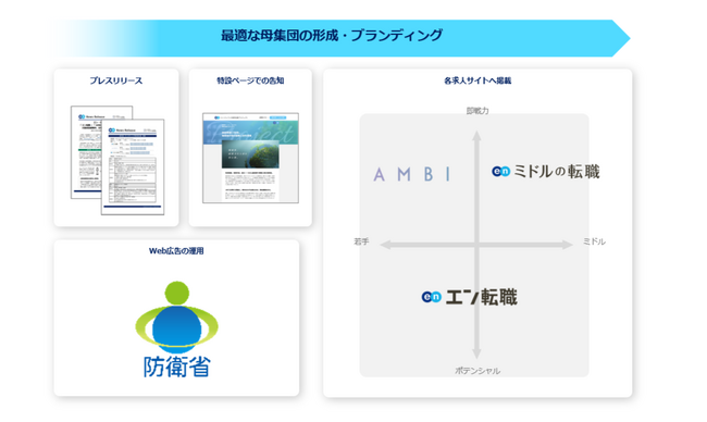 プレスリリースや特設ページ、Web広告での告知に加え、各求人サイトでの集客支援を行ないます。『エン転職』『AMBI』『ミドルの転職』とターゲットの異なる3つの求人サイトを活用することで、ターゲットへ網羅的に求人を届けます。