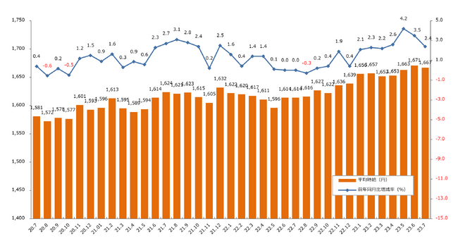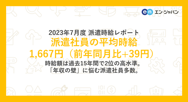 2023年7月度 派遣社員の平均時給は1,667円時給額は過去15年間で2位の高水準。「年収の壁」に悩む派遣社員多数。