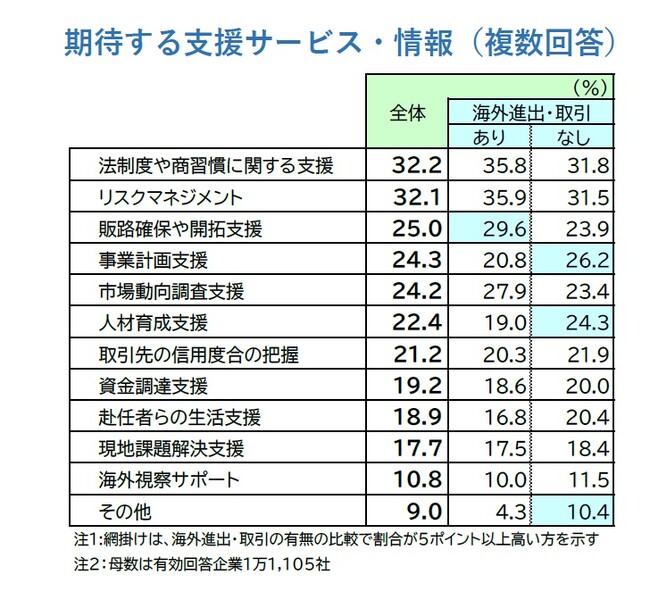 期待する支援サービス、「法制度や商習慣に関する支援」が32.2%でトップ(複数回答)
