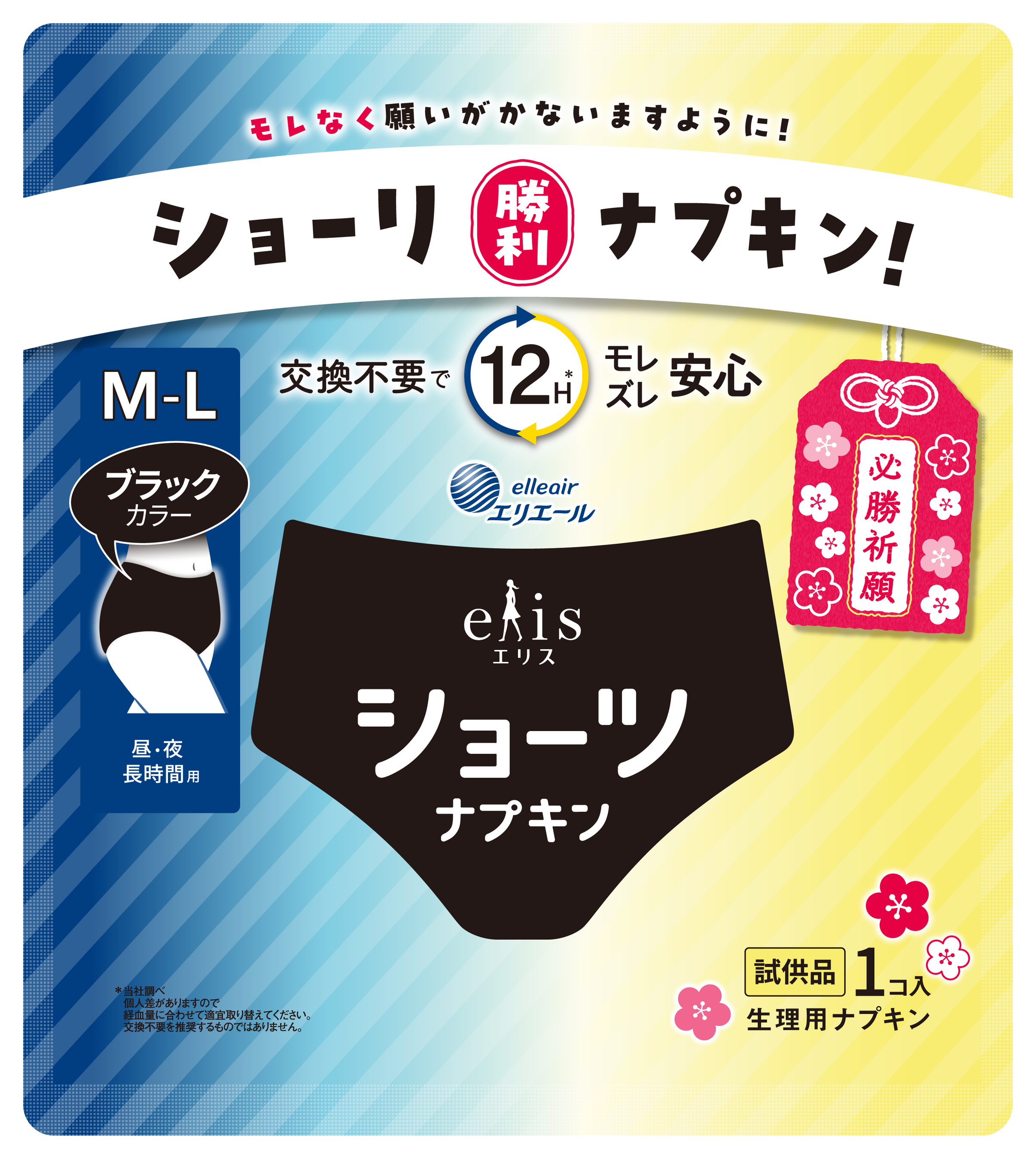 そこでこのたび、「エリス」は12時間交換不要※1の生理用ショーツ型ナプキン「エリスショーツ」を受験シーズンに使うことで、経血のモレやナプキンのズレを気にせず、安心して試験に挑んでいただきたいという想いから「エリスショーツ 受験応援キャンペーン」を開始します。本キャンペーンでは、「#モレなく願いがかないますように」というメッセージのもと、全国の高等学校(以下、高校)へ高校3年生を対象とした「エリスショーツ」のサンプリングと、受験生のお子さまを持つお母さまにも「エリスショーツ」で受験生をサポートしていただけるよう、親子を対象としたサンプリングを実施します。また、高校3年生を対象としたサンプリング企画については、ご協力いただける高校も募集します。「エリスショーツ」で受験シーズンの受験生やそのご家族をサポートしてまいります。