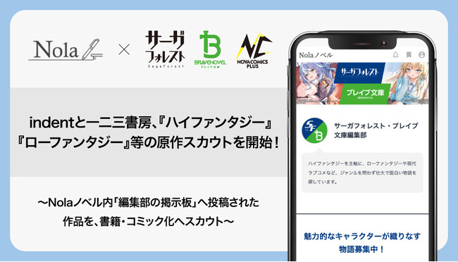 このたび、indentと一二三書房は、原作供給の連携を強化し、日本におけるノベル及びコミック市場の更なる発展と活性化に寄与することを目的に、indentが運営する「Nolaノベル」で展開中の「編集部の掲示板」内において、一二三書房が「サーガフォレスト・ブレイブ文庫編集部」及び「コミックノヴァ編集部」を新たに設置し、原作となる投稿作品のスカウトを本日より行うことといたしました。