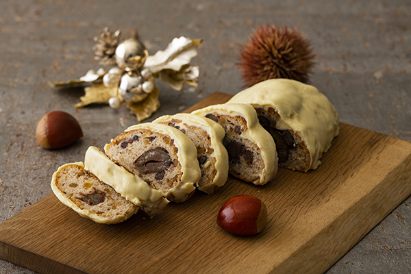 茨城県産の和栗と北海道産の大納言を柚子風味の生地で焼き上げました。仕上げに柚子が香るホワイトチョコレートでコーテイングした和風テイストのオリジナルシュトレンです。