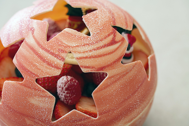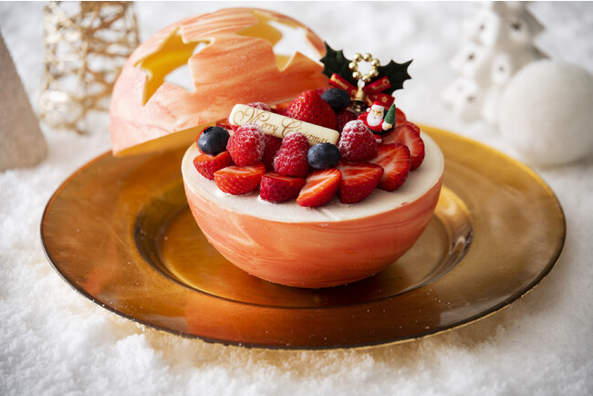 あまおうをふんだんに使用したショートケーキと、濃厚なレアチーズケーキを重ねた、贅沢な味わいをお楽しみいただける「ノエル プレミアム」。ホワイトチョコレートで球体の特別なデコレーションに仕上げた、パティシエ渾身のスペシャルケーキです。