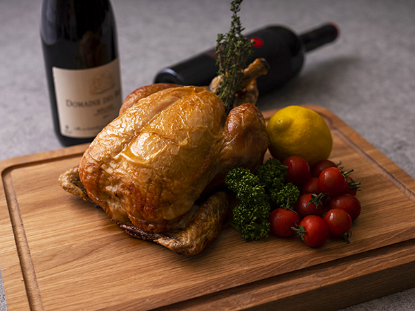 にんにく、ローリエ、タイムを詰めた大山どりをオーヴンでじっくりと焼き上げました。付属のオリジナルスパイスをお好みでつけてお召し上がりください。