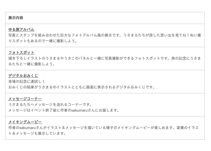 本イベントは、「ゆるく、楽しく、各地をめぐる」というテーマで、かわいいレトロな車に乗って旅をするうさまるたちが描き下ろしイラストで登場します。会場では描き下ろしイラストを使用したオリジナルグッズを販売するほか、オリジナル景品がもれなくもらえるミニゲーム「うさまるのひもくじ」、「うさこのガラポン」や、「うさまるとうさこのアイスカップ」などのオリジナルデザート&ドリンクを販売します。さらに、“ぬい撮り”が楽しめる「ゆる旅アルバム」やフォトスポット、デジタルおみくじ、うさまるたちへのメッセージコーナー、作者のsakumaruさんによるイラストのメイキングムービーなどの特別展示をお楽しみいただけます。