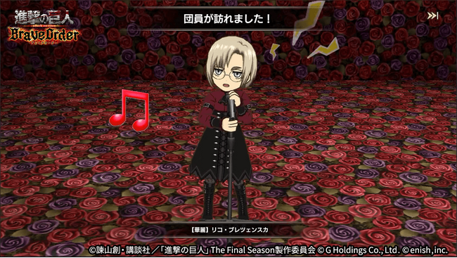 株式会社enish(本社:東京都港区、代表取締役社長:安徳 孝平、以下enish)は、アニメ『進撃の巨人』のスマートフォンゲーム最新作「進撃の巨人Brave Order」にて、6月30日(金)より、新イベント「お洒落は華麗に、大胆に」を開催!イベントアイテムを集めて期間限定衣装やおもてなしアイテムを手に入れよう!また、本日より新登場の【華麗】リヴァイ、【華麗】リコ・ブレツェンスカ、【華麗】ペトラ・ラルがピックアップされた「お洒落は華麗に、大胆にガチャ」も開催!その他、最新情報はゲーム公式サイト・ゲーム公式Twitterアカウントにて随時公開して行きますので、ぜひご覧ください。