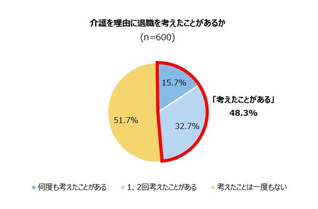 親族の介護中もしくは過去に介護をしたことがある管理職600人に対し、「介護を理由に退職を考えたことはありますか」と質問したところ、2人に1人となる48.3%が「考えたことがある」と回答しました。2017年に同じ内容で調査を行った際には、47.5%が「考えたことがある」と回答しており、今回は微増となりました。