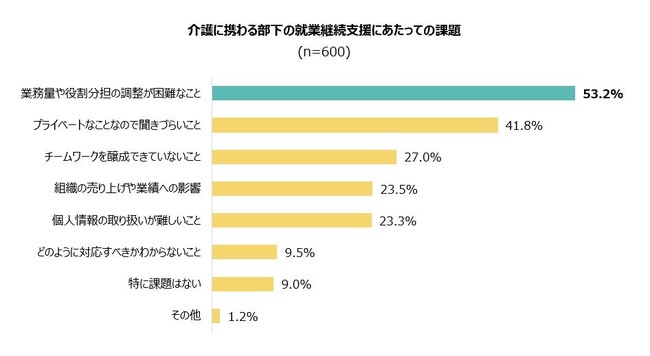 介護に携わる部下の就業継続を支援するにあたっての課題のトップは、「業務量や役割分担の調整が困難なこと」だった。