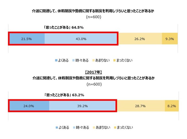 親族の介護中もしくは過去に介護をしたことがある管理職の64.5%が、介護に関連して休暇制度や勤務に関する制度を利用しづらいと思ったことがあると回答した。2017年も63.2%が同様に回答しており、改善は見られなかった。