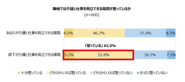 2017年の調査で、自分が介護と仕事を両立できる環境が整っていると答えたのは51.7%、部下が両立できる環境が整っていると答えたのは54.7%だった。今回の調査では、前者は54.7%と変化が小さかったものの、後者が62.0%と大きく増加(+7.1ポイント)し、一般社員にとっては介護と仕事を両立しやすくなっていることが伺えた。
