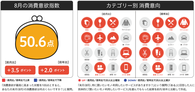 夏休みや帰省シーズンの影響で、「旅行」や「外食」を中心に幅広いカテゴリーで消費意向が大きく高まっているようです。