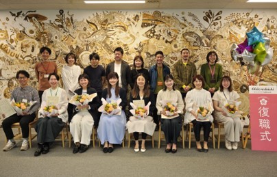 食品のサブスクリプションサービスを提供するオイシックス・ラ・大地株式会社(本社:東京都品川区、代表取締役社長:高島 宏平)は、育児休業を終えて2023年4月1日より復職をした社員11名(女性10名、男性1名)に対して“おかえりなさい”を直接伝える「復職式」を本日4月28日に実施しました。「復職式」は2017年から実施しており、2020年から2022年は新型コロナウィルス感染拡大防止のためオンラインで実施、今年は4年ぶりのリアル開催となります。