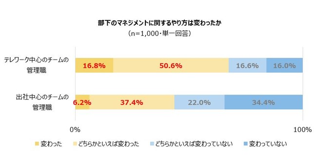 日本全国の自身も含めテレワーク中心で働くチームの管理職500人と、出社中心で働くチームの管理職500人に対し、「コロナ禍以前と以後で、部下のマネジメントに関するあなたのやり方は変わりましたか」と質問したところ、テレワーク中心のチームの管理職は、67.4%がコロナ禍でやり方が変わったと回答しました。一方、コロナ禍で部下のマネジメントのやり方が変わったと回答した出社中心のチームの管理職は43.6%で、20ポイント以上の違いがありました。