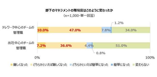 部下のマネジメントの難易度について、テレワーク中心のチームの管理職は、57.0%がコロナ禍で難易度が上がったと回答した。一方、出社中心のチームの管理職で難易度が上がったと回答したのは43.8%で、10ポイント以上の違いがあった。