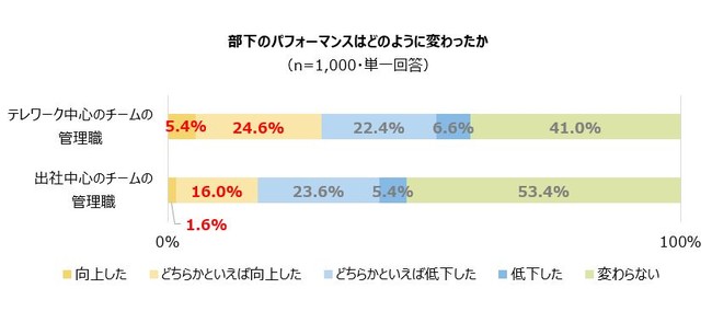 テレワーク中心のチームの管理職は、30.0%がコロナ禍で部下のパフォーマンスが向上したと回答した。一方、出社中心のチームの管理職で部下のパフォーマンスが上がったと回答したのは17.6%で、10ポイント以上の違いがあった。
