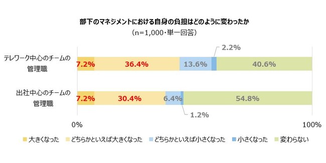 部下のマネジメントにおける自身の負担について、テレワーク中心のチームの管理職は、43.6%がコロナ禍で負担が大きくなったと回答した。出社中心のチームの管理職で負担が大きくなったと回答したのは37.6%で、6.0ポイントの違いがあった。