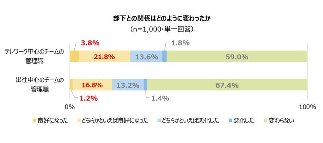 テレワーク中心のチームの管理職は、25.6%がコロナ禍で部下との関係が良好になったと回答した。出社中心のチームの管理職で部下との関係が良くなったと回答したのは18.0%で、7.6ポイントの違いがあった。