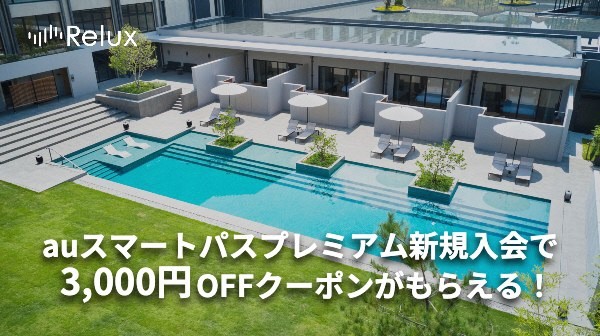 内容:対象期間内に、auスマートパスプレミアムに新規入会された方を対象に、宿泊予約サービス「Relux」で利用可能な3000円分のクーポンを配布します。すでにReluxの会員の方も対象です。