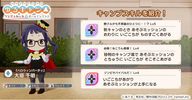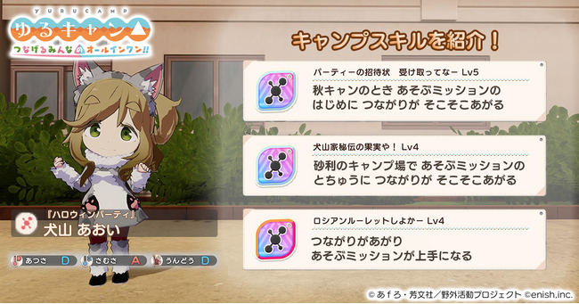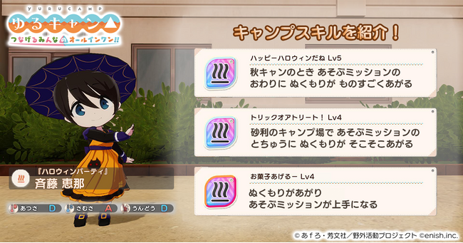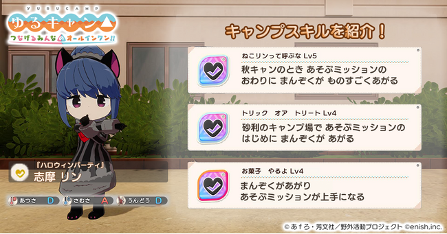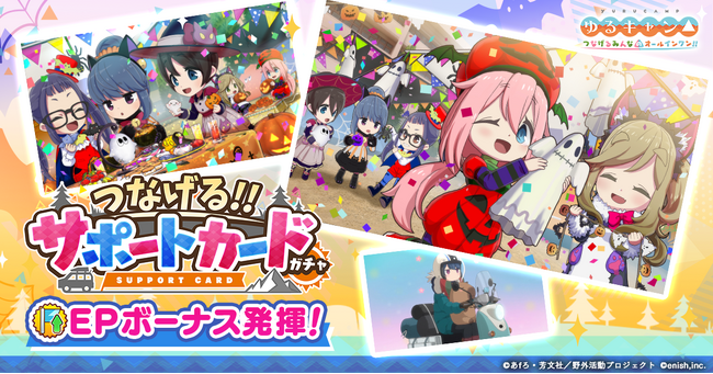 株式会社enish(本社:東京都港区、代表取締役社長:安徳 孝平、以下enish)は、2023年9月30日(土)より、TVアニメ『ゆるキャン△』初となるオンラインゲーム「ゆるキャン△ つなげるみんなのオールインワン!!」(以降、「つなキャン」もしくは「つなキャン△」)にて、新イベント「みんな集まれ! ハロウィンパーティーの招待状」を開催いたします。本日、「野外活動だよりVol.07」を公開し、新イベントの変更点などについて説明しております。