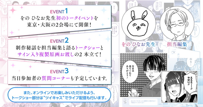 イベントでは、制作秘話を担当編集と語るトークショーやサイン入り複製原画のお渡し、参加者からの質問コーナーなどを予定しています。
