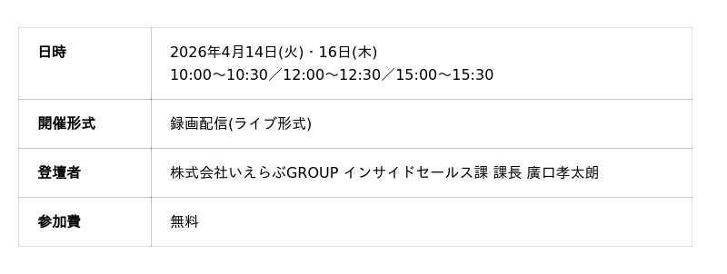不動産業界特化のDX支援サービスを展開する株式会社いえらぶGROUP(本社:東京都新宿区、代表取締役:岩名泰介、以下「いえらぶGROUP」)は、4月14日(火)・16日(木)の2日間、録画配信(ライブ形式)にて、『「近くの不動産会社」で1位を獲得!Googleマップ×自社HP×AIで来店を最大化する方法』セミナーを開催いたします。