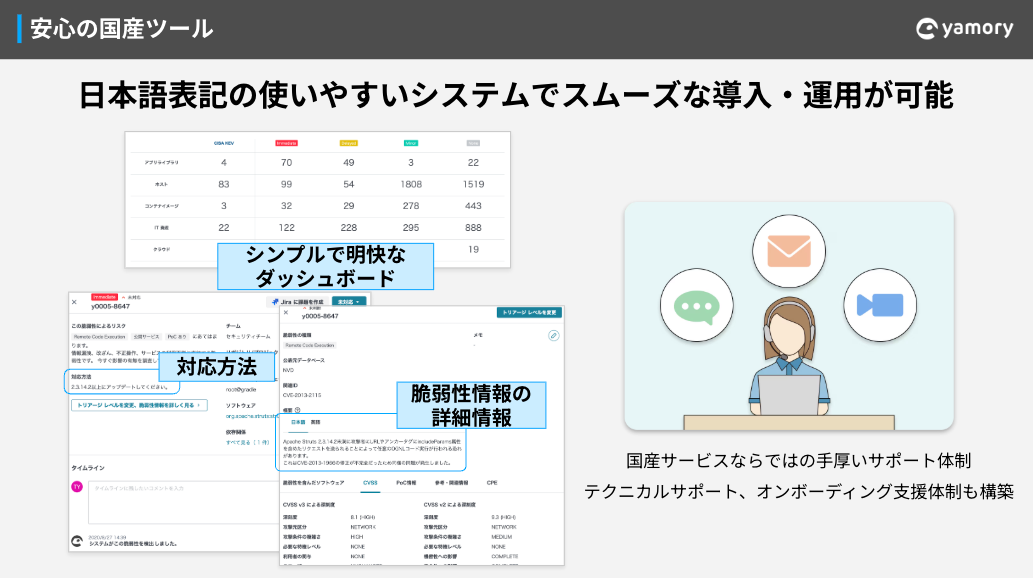 yamoryは、日本国内で開発・販売している国産のセキュリティサービスです。海外製品が多いセキュリティ市場において、日本の商習慣や運用に合わせたきめ細やかなサポートを提供しています。 日本語での手厚いテクニカルサポートや、導入時のオンボーディング体制も構築しており、安心して運用を開始いただけます。