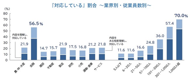 『対応している』企業を業界別にみると、『金融』が56.5%と最も高く唯一半数を超えた。次いで、『農・林・水産』、『製造』(ともに21.9%)、『サービス』(21.8%)、『運輸・倉庫』(21.2%)が2割台で続いた。