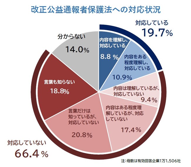 改正公益通報者保護法に関して、「内容を理解し、対応している」企業は8.8%にとどまり、「言葉も知らない」(18.8%)は2割近くにのぼった