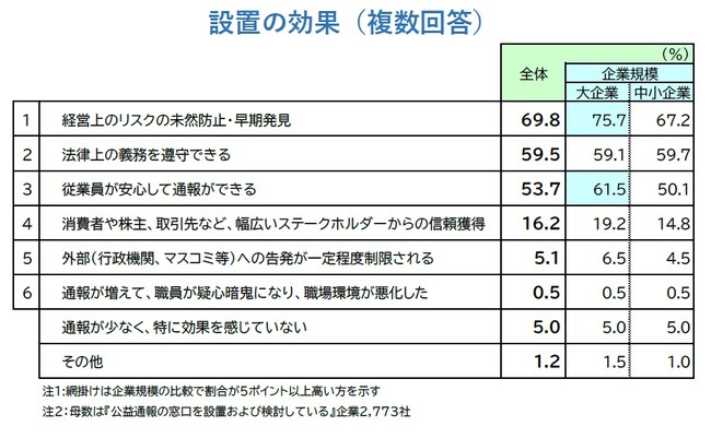 他方、設置企業の多くは「経営上のリスクの未然防止・早期発見」や「従業員が安心して通報ができる」などの効果を実感している。