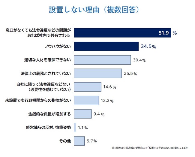 設置しない理由、「窓口がなくても法令違反などの問題があれば社内で共有される」(51.9%)企業が半数を超えた(複数回答)