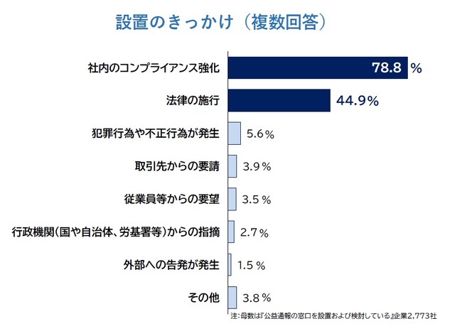 設置のきっかけは、「社内のコンプライアンス強化」(78.8%)が8割近くに(複数回答)
