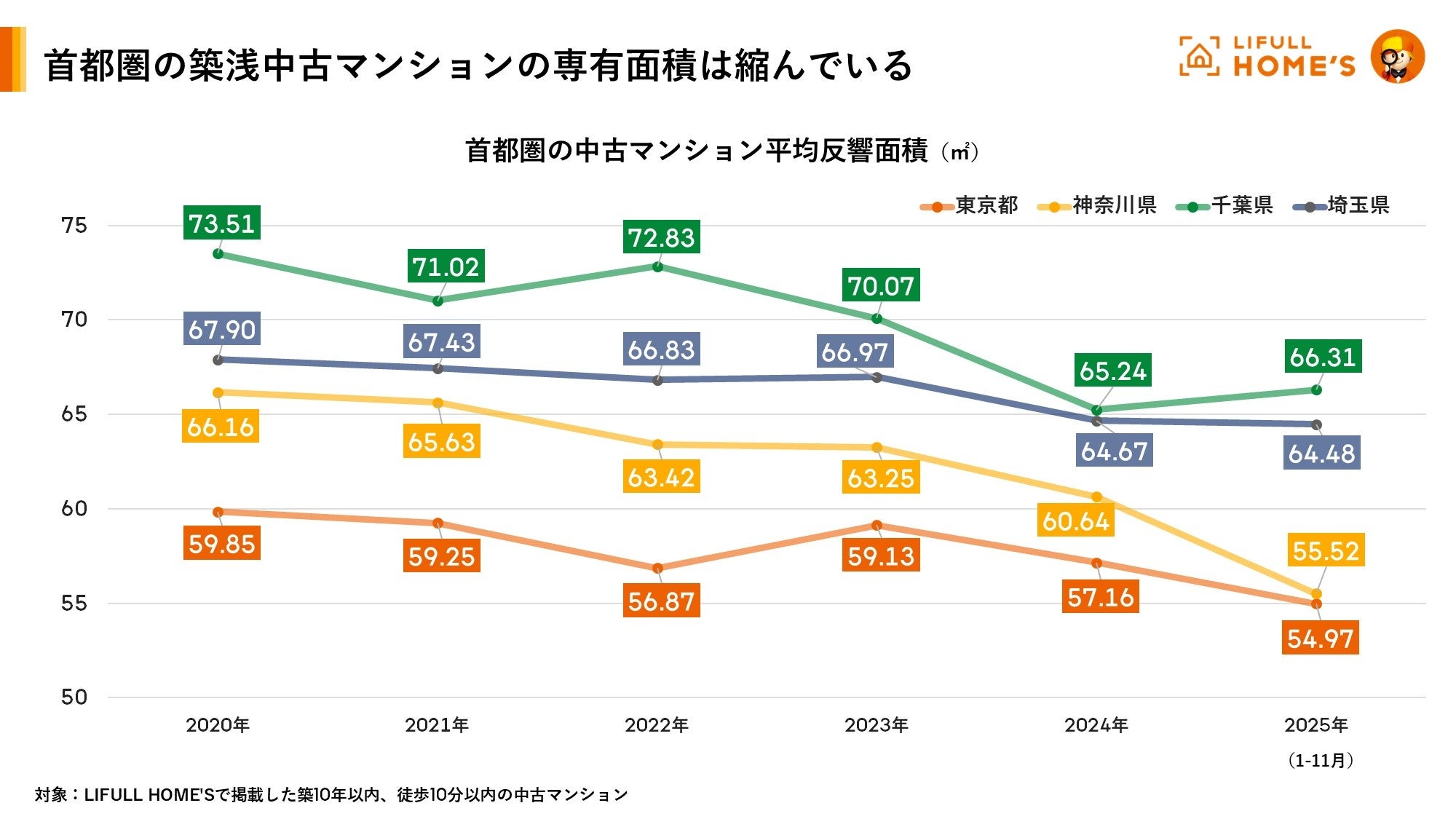 現在、首都圏のマンション市場では、価格の高騰だけでなく「専有面積の縮小化」がトレンドとなっています。新築マンションのみならず、市場に流通する築浅の中古マンションにおいても住戸のコンパクト化が進み、ゆとりある広さを確保することは年々難しくなっています。