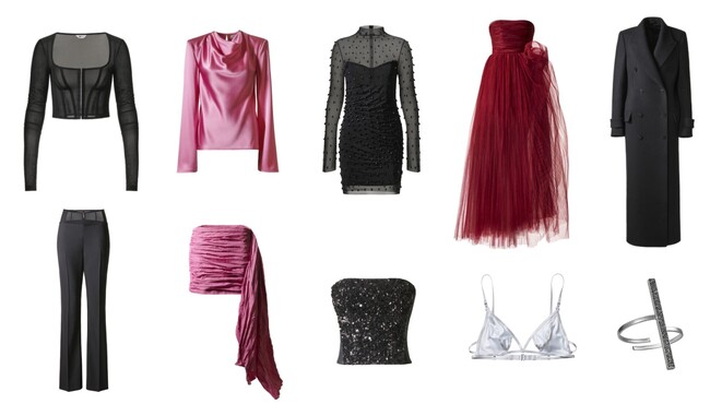 本コレクションには、ドラマティックなレッドのボリューミーなチュール・ボールガウン、ブラッシュ・ピンクのレース・パネル付きイブニングドレス、チラリとのぞくネックラインがきらめくメッシュのミニドレスなど、魅惑的なアイテムが揃います。メッシュで縁取られたブラックのパンツは、クロップド丈のコルセットトップや、ゆったりとしたブレザーと組み合わせられる他、スリンキーなシルバーのスリップドレスと足首まですっぽりと覆う黒のオーバーコートといった、時代を超越した魅力的な組み合わせが特徴です。また、アクセサリーは、幾何学模様のジュエリーとミニマルなストラップサンダルでエッジを効かせています。