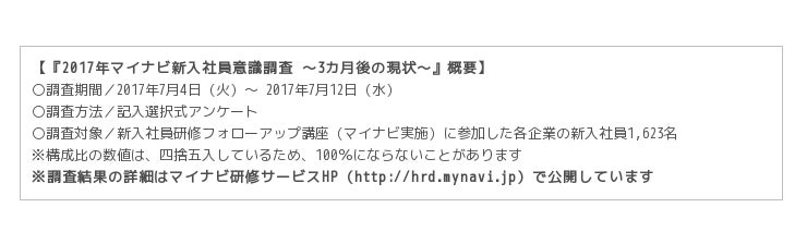 株式会社マイナビ(本社:東京都千代田区、代表取締役社長:中川信行)は、2017年4月入社の新入社員を対象とした「2017年マイナビ新入社員意識調査 〜3カ月後の現状〜」の結果を発表しました。本調査は、当社がサービス提供する「新入社員研修フォローアップ講座」に参加した各企業の新入社員1,623名に、入社3カ月後の意識についてアンケートしたものです。2012年から実施し、今年で6回目です。