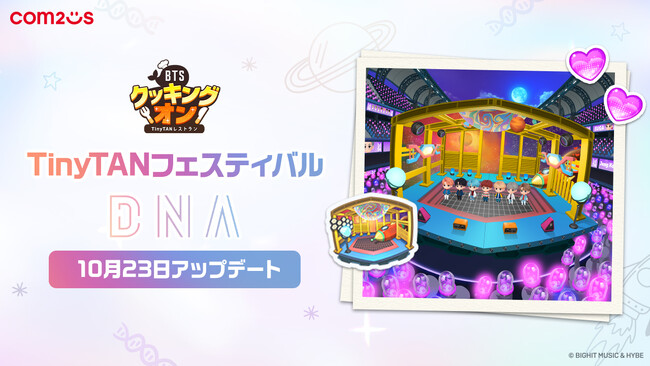 スマートフォン向けモバイルゲームをサービスしている株式会社Com2uS Japanは、新作料理ゲーム『BTSクッキングオン:TinyTANレストラン』にて、新しいTinyTANフェスティバル「DNA」を追加するアップデートの実施をお知らせいたします。