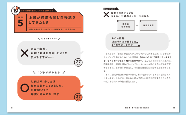 本書では、心理学の研究者が理論に基づき、「お願いする」「謝罪する」「言いにくいことを言う」「自己アピールする」「共感する」「ほめる」「叱る」「本音を引き出す」という8つのテーマにおける10秒の使い方を解説しています。