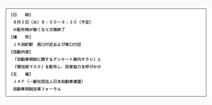 JAF(一般社団法人日本自動車連盟 会長 坂口正芳)と自動車税制改革フォーラム(自動車関連21団体で構成)は、より多くの自動車ユーザーの意見を集めるために8月2日(水)に東京都港区のJR田町駅前で街頭活動を実施します。