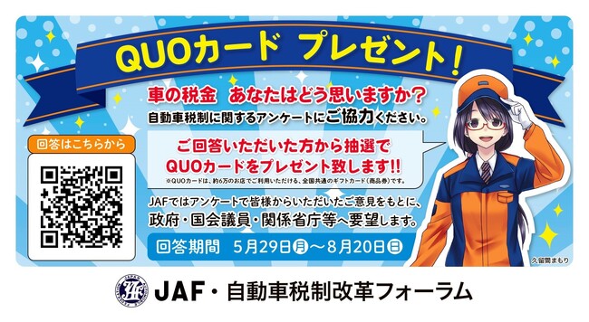 JAF・自動車税制改革フォーラムは自動車関係団体が幅広く連携し、自動車ユーザーの税負担軽減や不合理な税体系の見直しに向け活動しています。このたびは多くの方々に自動車税制の仕組みを知っていただくとともに、現在実施している「2023年度自動車税制に関するアンケート調査」に回答いただくため、下記のとおり街頭活動を実施いたします。