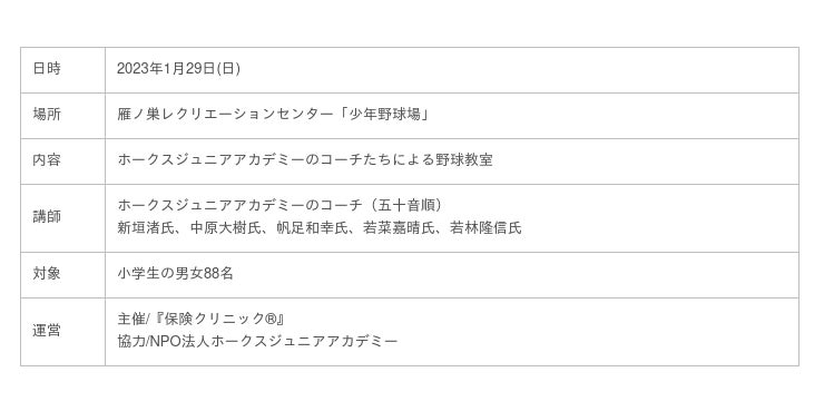 ウェブサイト:https://www.hoken-clinic.com/social_activities/baseballclass2023.html
