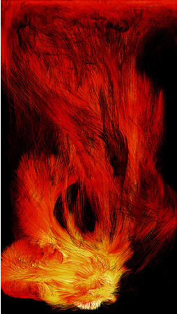 燃焼する気体の流れによって、空間上に線を描き、その線の立体的な集合で炎をつくり、チームラボが考える「超主観空間」によって平面化し、炎を描いた。